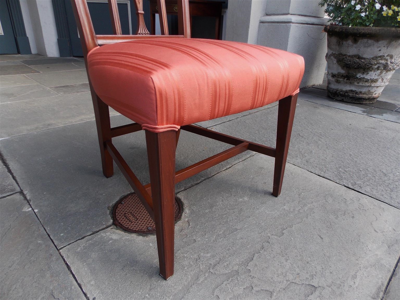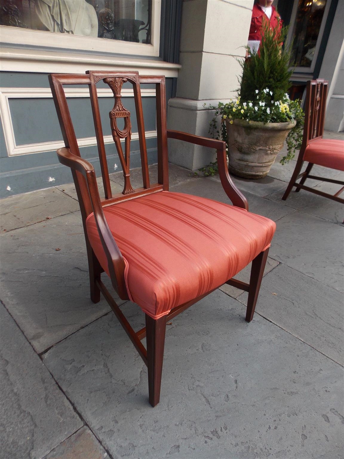 American Charleston mahogany arm & side chair with carved molded edges, flanking fan corners, centered splat backs with Prince of Wales plumes, swags, and terminating on the original tapered squared legs with connecting stretchers, Late 18th Century.