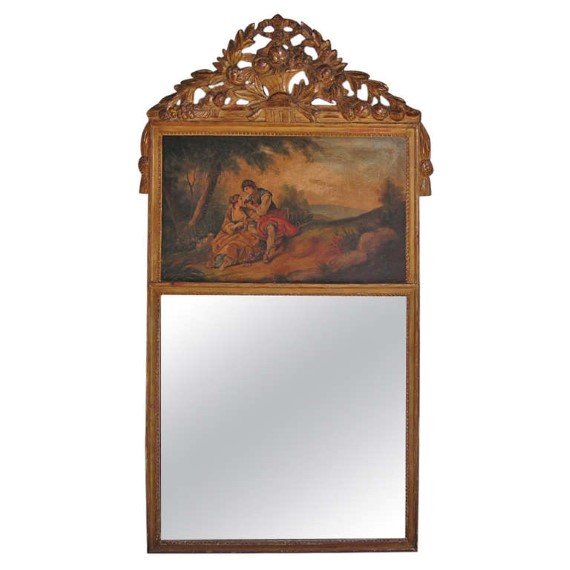 French gilt trumeau mirror with carved centered floral fruit basket, with original oil on canvas landscape and original glass. Circa 1780