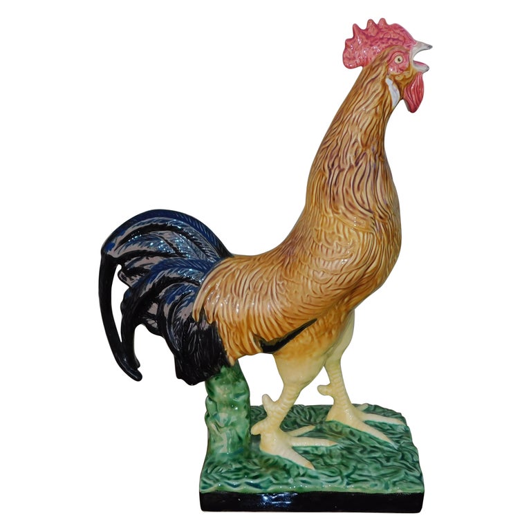 Portuguese Majolica Vibrant Colored Crowing Rooster on Rectangular Base, Circa 1884