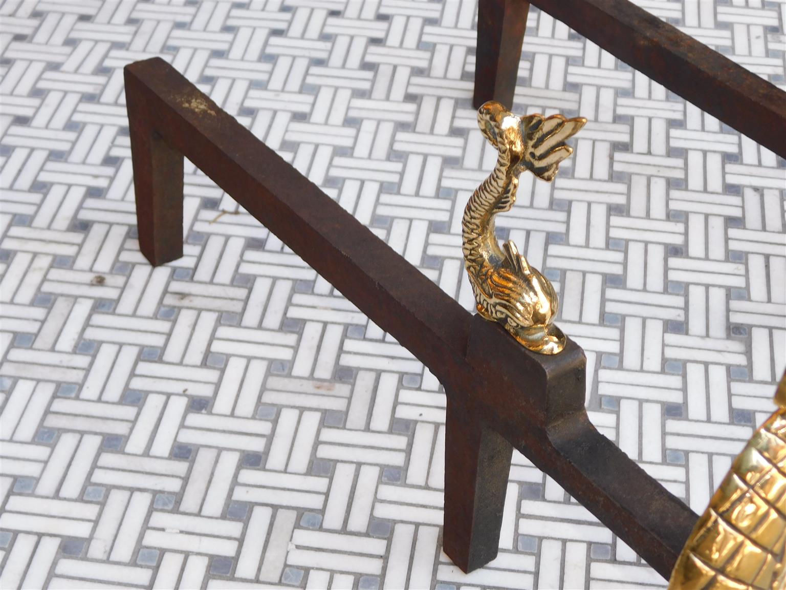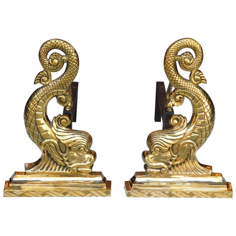 Pair of American Polished Brass Dolphin Andirons with Matching Log Stops, C 1880
