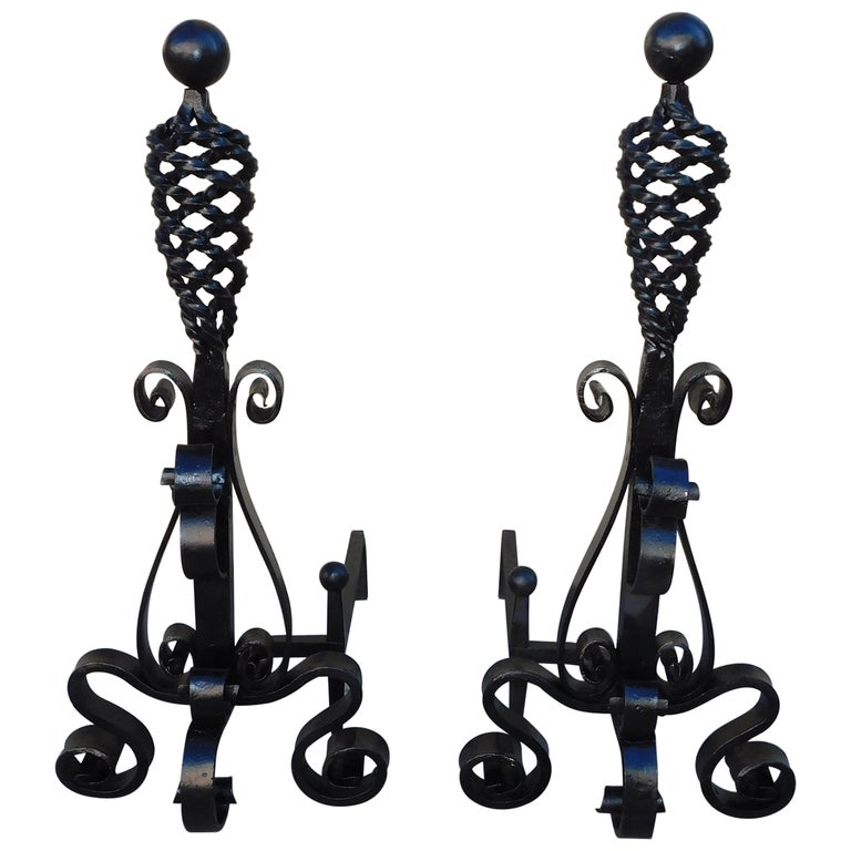 Pair of American Wrought Iron Spiral Ball Finial Andirons with Scrolled Legs, 1820
